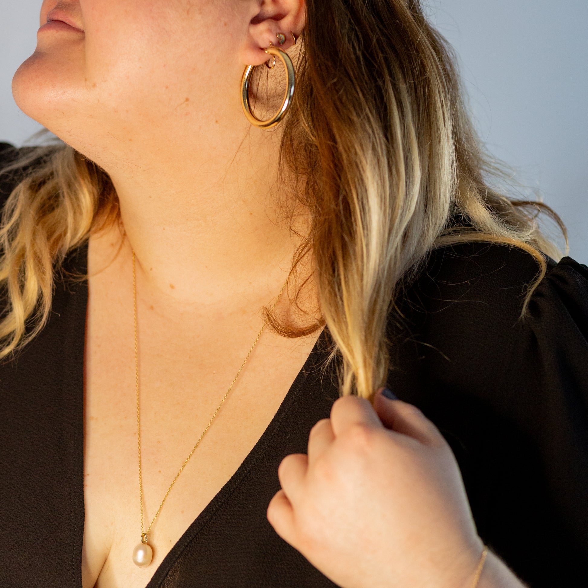 Elevate your layering style with the Big Baroque Pearl Drop with Diamonds. The unique combination of the natural Baroque pearl and machine rope chain strikes the ideal balance between femininity and edginess. We couldn't resist and had to add 5 diamonds to the bail for an added sparkle. Pair it with another XXL best seller to create a stunning layered look that's sure to turn heads.