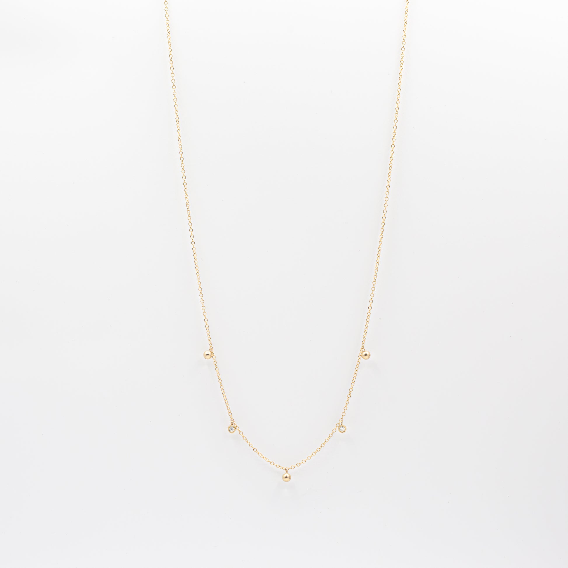 Diamond and Gold Ball Dangle Necklace offers 2 bezel set round diamonds and 3 round gold balls strung along a gold cable chain for a classic but fun look that will dance around your neck. She's stunning on her own or you can stack her with other best selling XXL styles.