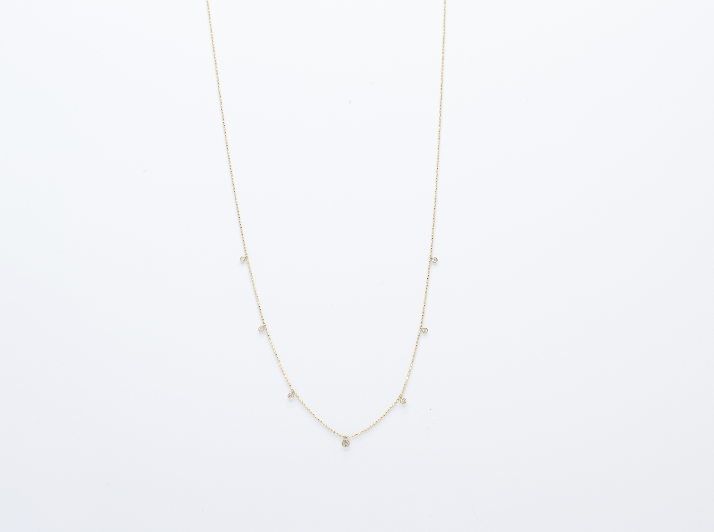 Oh la la! How chic! This necklace adds the perfect certain something to your stack - or she's pretty enough to wear all on her own. The 7 bezeled diamonds are attached to a sparkly diamond cut bead chain so you get sparkle on sparkle on sparkle.