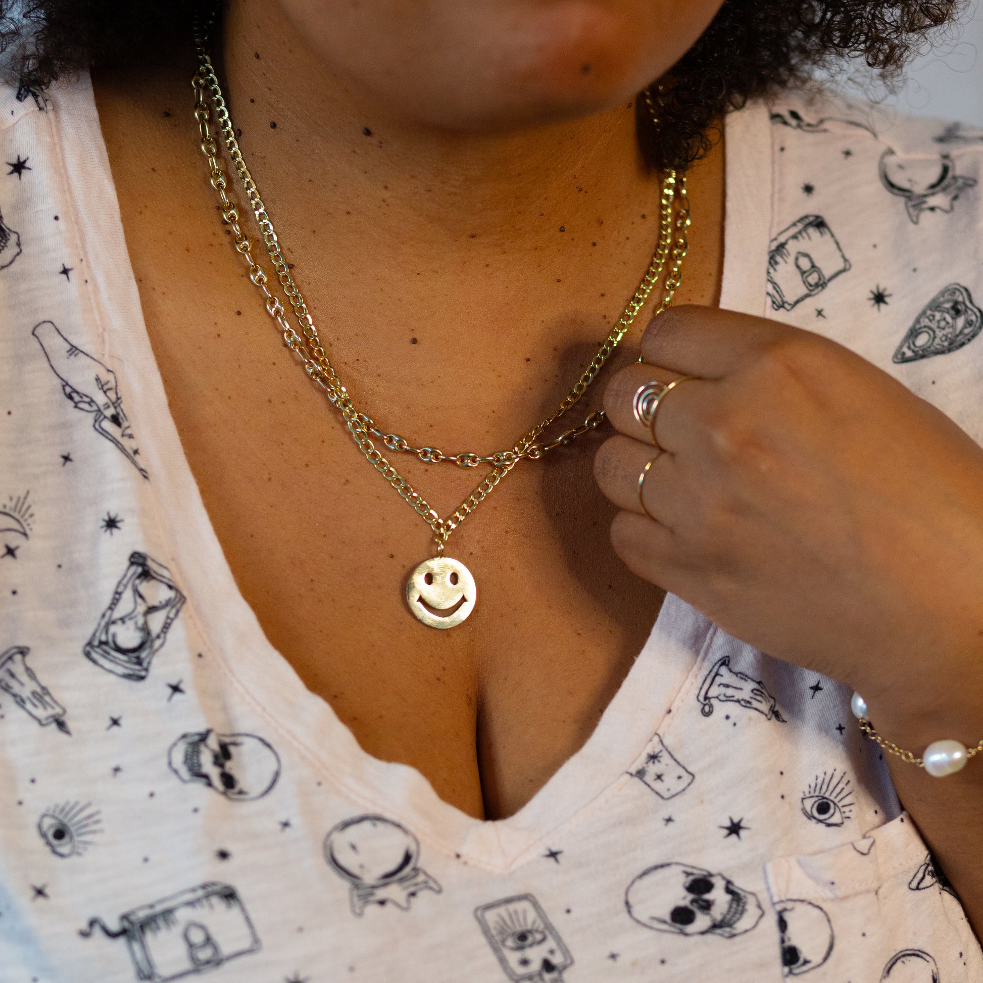The perfect touch of fun, playful energy to your jewelry stack! The Thicc Smiley Curb chain offers a solid smiley face charm attached to a hefty 3.5mm hollow curb chain. Wear this solo for a bold touch of whimsy, or stack it for an even more unique look.